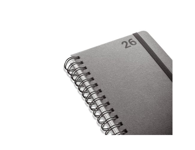 Agenda A5, com argolas, em pele (58% reciclada). Possui um elástico para fecho da agenda. Está organizada num plano diário. 148 x 210 mm