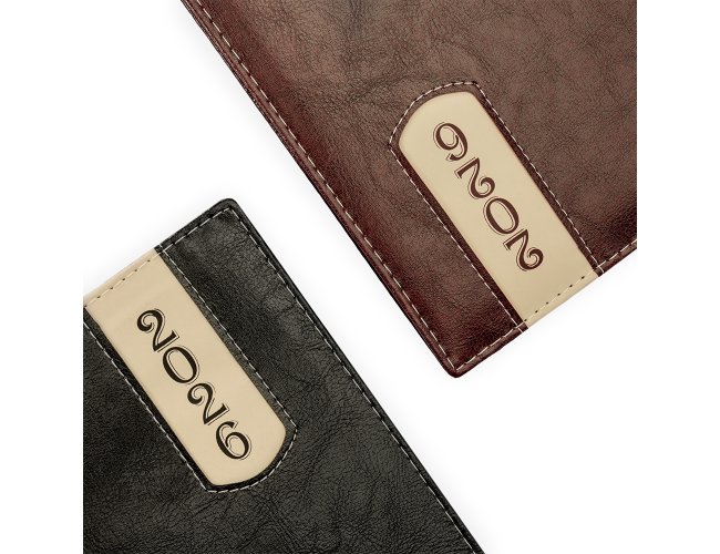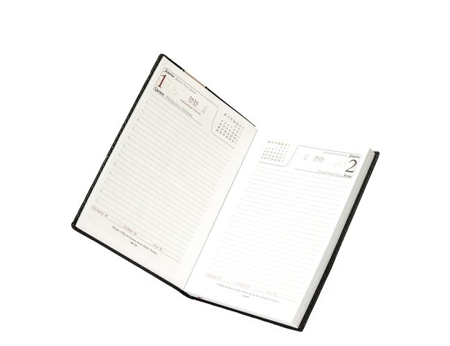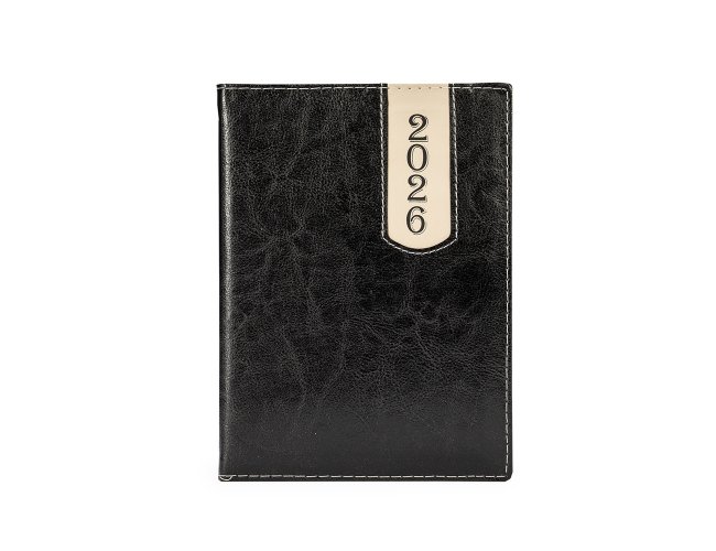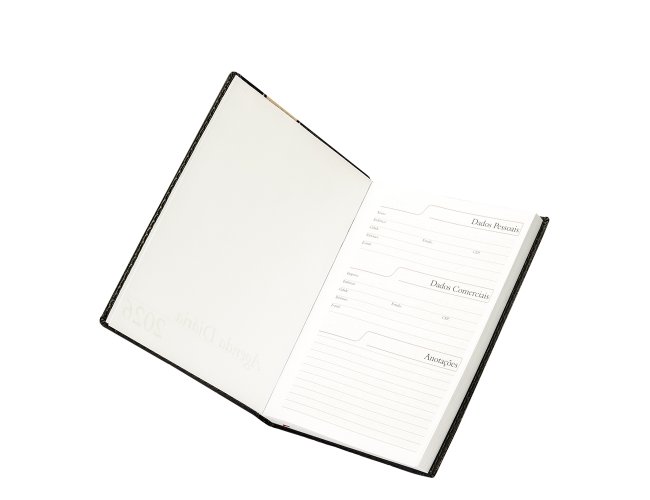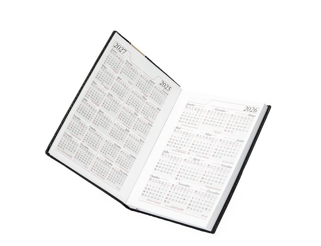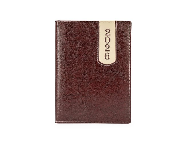 Agenda diária com capa em couro sintético, detalhes de costura e o ano "2026" presente no canto superior direito. Contém marca-páginas em fita de cetim, páginas dedicadas a dados pessoais, calendários de 2025 a 2027, contatos, planejamento diário e mapas. OBS.: PEDIDOS APENAS MÚLTIPLOS DE 10 PEÇAS!
