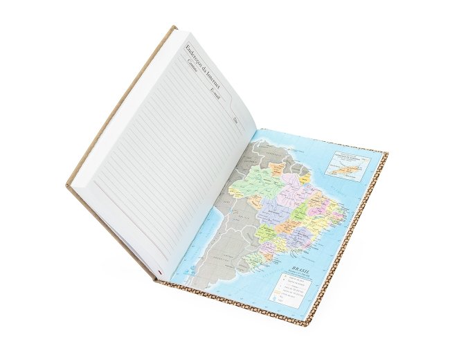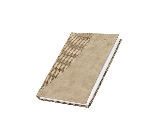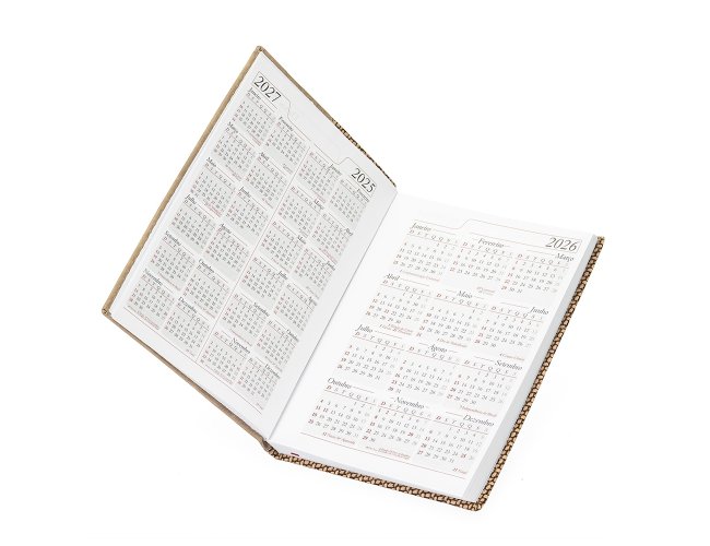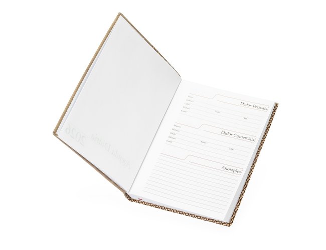 Agenda diária 2026 em couro sintético com detalhes texturizados e marca-páginas em fita de cetim. Contém páginas dedicadas a dados pessoais, calendários de 2025 a 2027, lista de contatos, planejamento diário e mapas. OBS.: PEDIDOS APENAS MÚLTIPLOS DE 10 PEÇAS!
