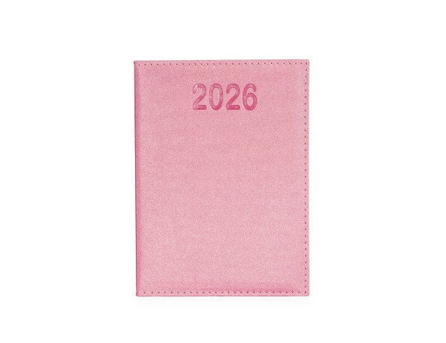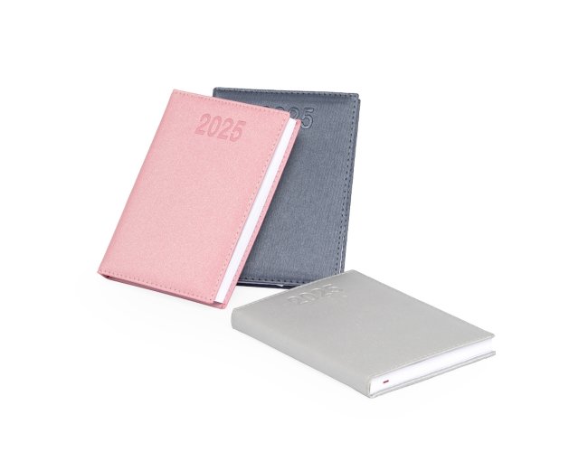 Agenda diária 2026 com capa em couro sintético metalizado e marca-páginas em fita de cetim. Possui páginas dedicadas a dados pessoais, calendários de 2025 a 2027, lista de contatos, planejamento diário e mapas. OBS.: PEDIDOS APENAS MÚLTIPLOS DE 10 PEÇAS!