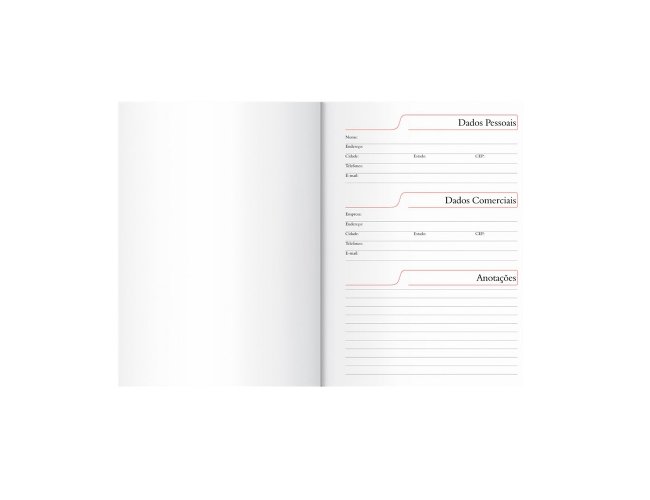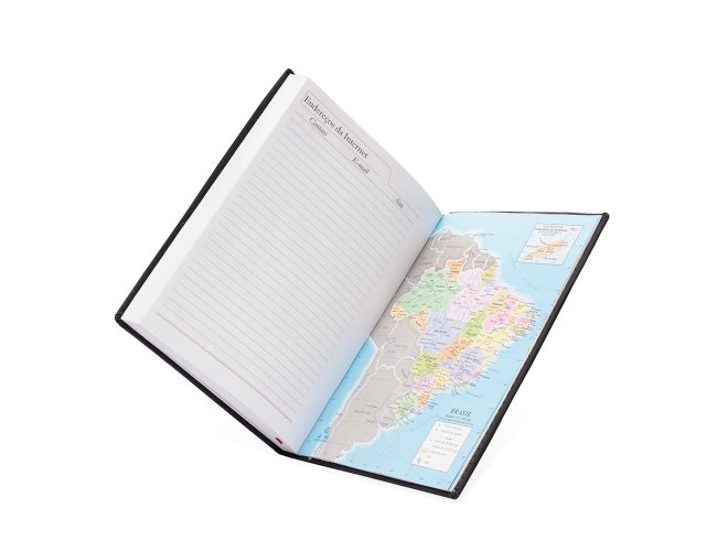 Agenda diária 2026 emborrachada. Contém fita de cetim marca página, dados pessoais, calendários de 2025 à 2027, mapa do Brasil, mapa-múndi, índice telefônico e planejamento.