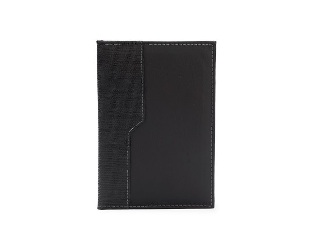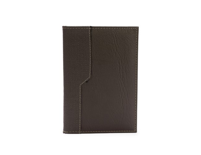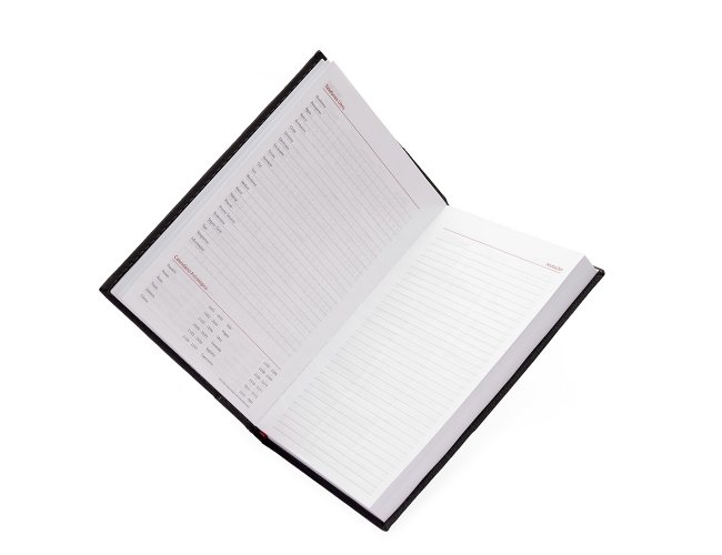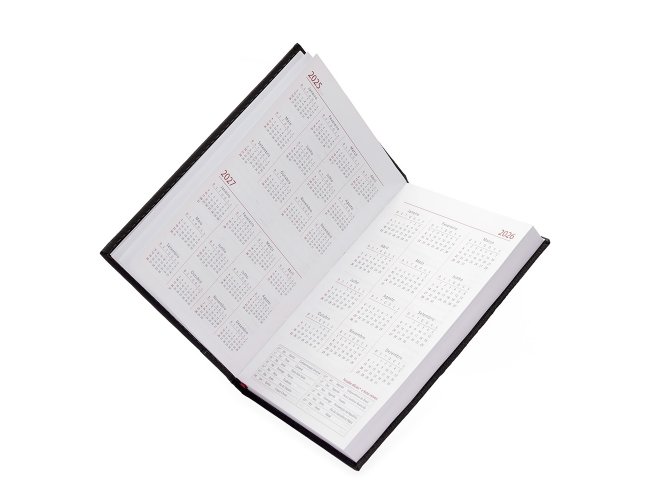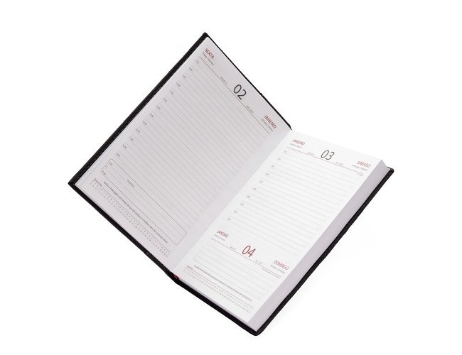 Agenda diária 2026 com capa em couro sintético e marca-páginas em fita de cetim. Apresenta páginas dedicadas a dados pessoais, calendários de 2025 até 2027, listas de telefones úteis, planejamento diário e financeiro, lista de contatos e mapas.