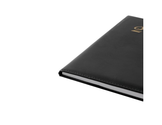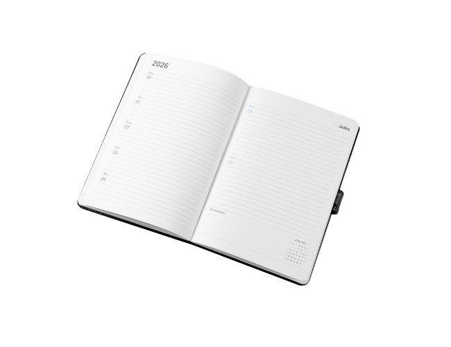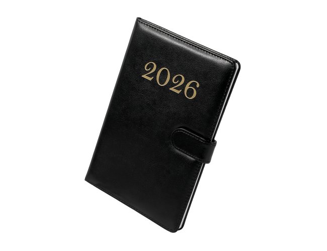 Agenda semanal com capa em poliuretano (PU) e fecho magnético. Contém páginas dedicadas a dados pessoais, calendários 2026 a 2028, planejamento diário de 2026 e lista de códigos DDI.