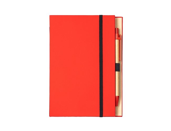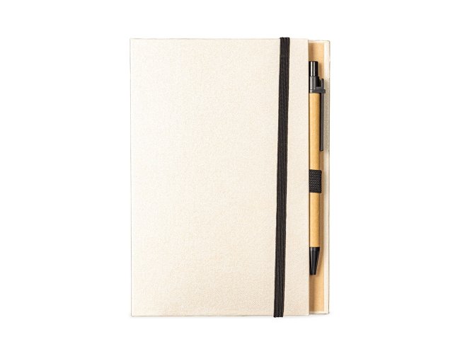 Um bloco de anotações com capa revestida em papel especial e fita elástica para fechamento. Contém aproximadamente 80 folhas amareladas destacáveis com pauta, além de um bloco com cerca de 20 folhas autoadesivas amarelas e aproximadamente 100 marcadores de página autoadesivos, divididos em cinco cores diferentes. Acompanha uma caneta esferográfica com carga azul de 1.0mm e acionamento por clique, corpo em papelão e demais componentes em plástico.