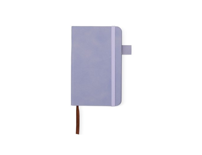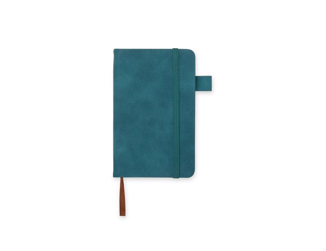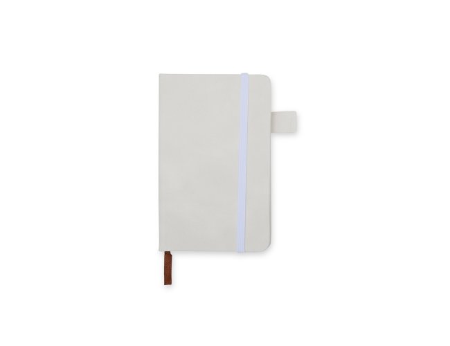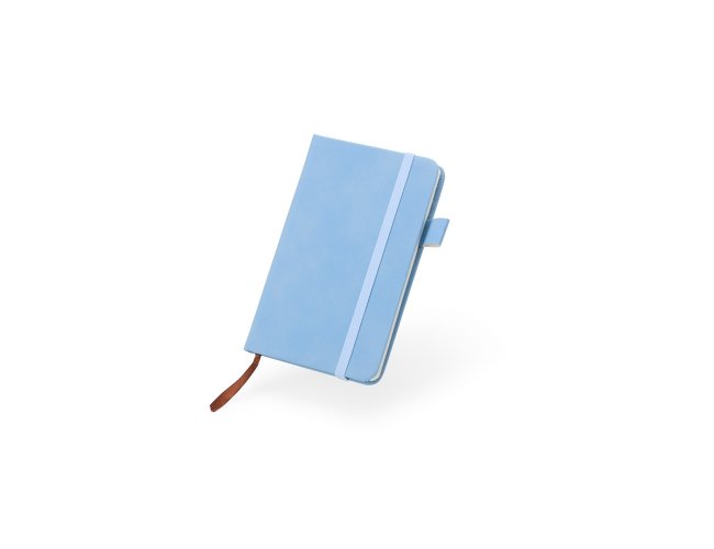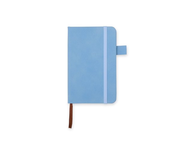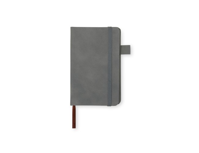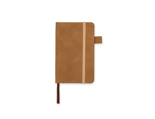 Caderneta em PU com marcador de página em cetim e fita elástica para fechar. Contém aproximadamente 80 folhas amareladas sem pauta.