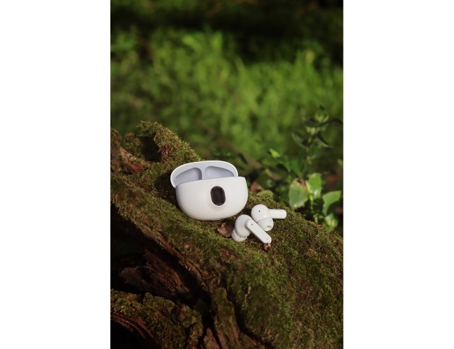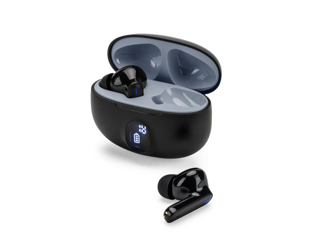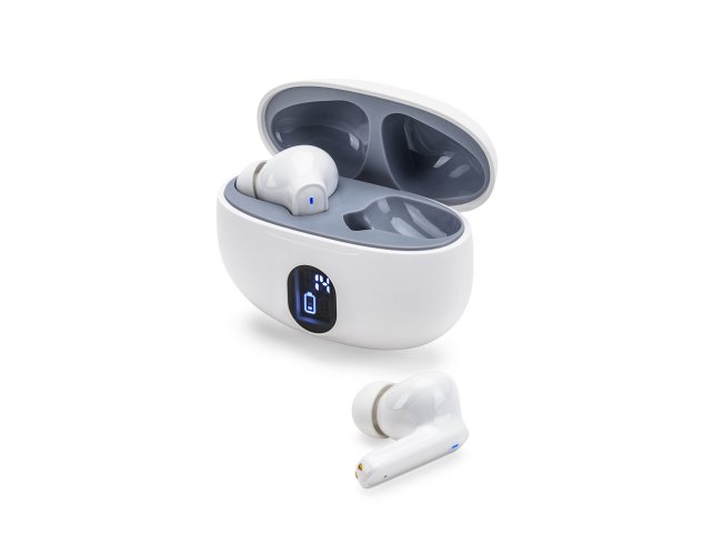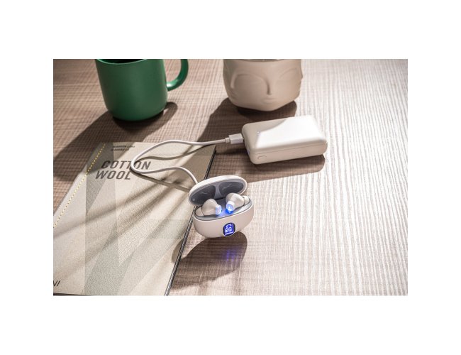 Fones de ouvido wireless em ABS 100% reciclado, com transmissão BT v5.4. A caixa de carregamento tem uma tela digital que mostra o nível de carga e tem uma capacidade de 200 mAh, oferecendo uma autonomia, aproximada, de 4h. Os fones de ouvido permitem atender chamadas, controlar o volume e a playlist do dispositivo móvel. Incluso um cabo de carregamento USB-C. Fornecido em caixa presente de papel kraft reciclado. 61 x 49 x 29 mm | Caixa: 62 x 32 x 74 mm