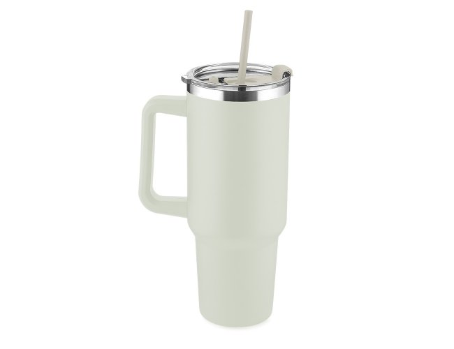 Caneca térmica de 1,3 litros em inox reciclado com parede dupla (interno 304, externo 201), acabamento em pintura a pó, tampa e canudo em plástico PP na cor do produto.