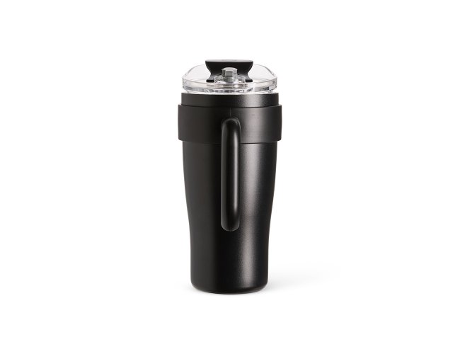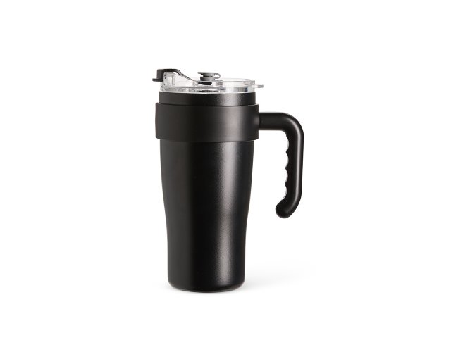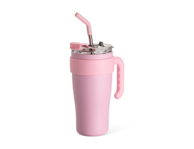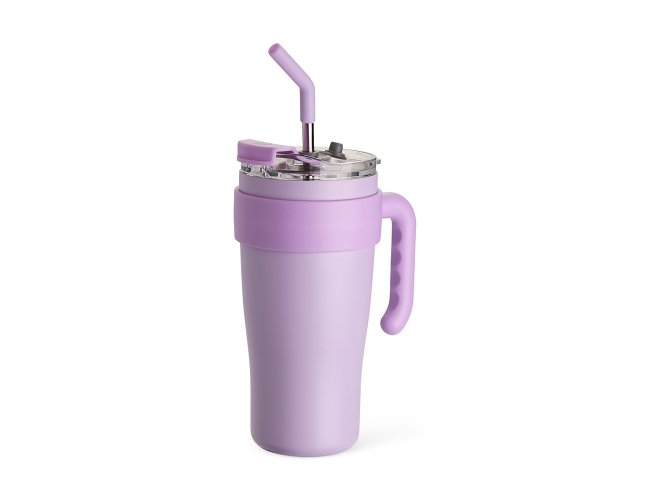 Caneca térmica em inox com capacidade máxima de 800ml. Possui estrutura em parede dupla, alça ergonômica em plástico, tampa rosqueável com vedação a vácuo, protetor para bocal e acesso para canudo com tampa em silicone. Acompanha canudo de inox com ponta de silicone removível.