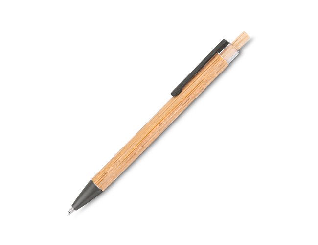 Caneta com corpo e acionador em bambu, detalhe em plástico no acionador, ponteira e clipe cinza fosco.