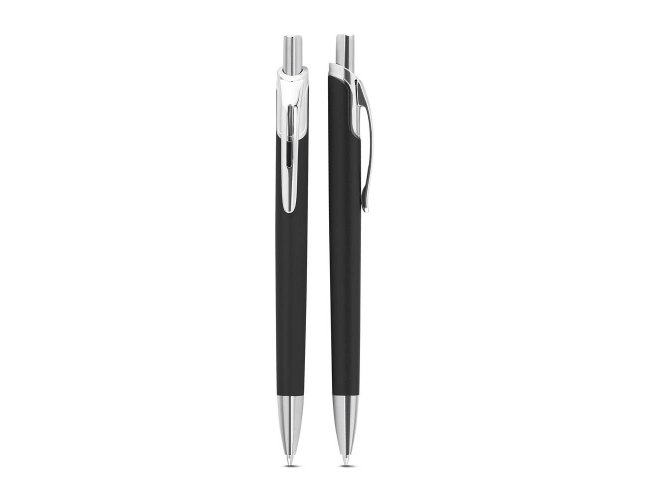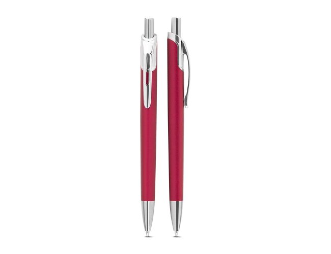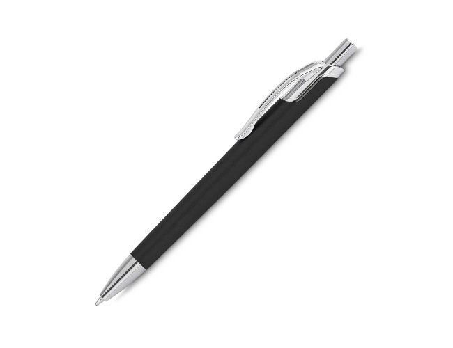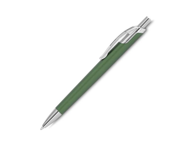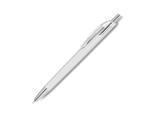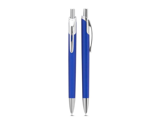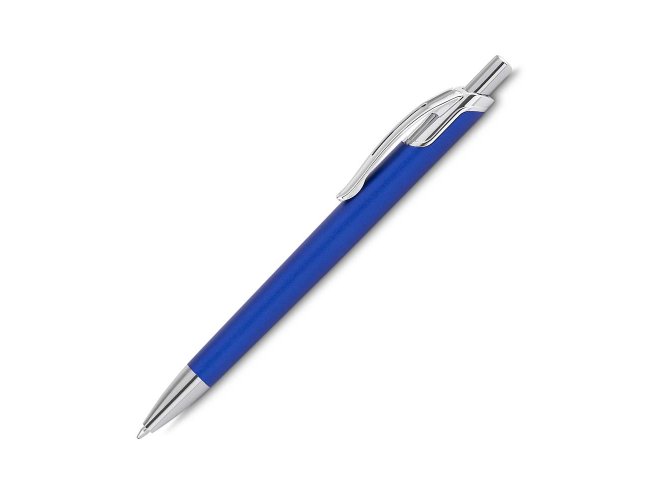 Caneta com corpo em alumínio reciclado, acionador e clipe cromado, escrita esferográfica em azul.
