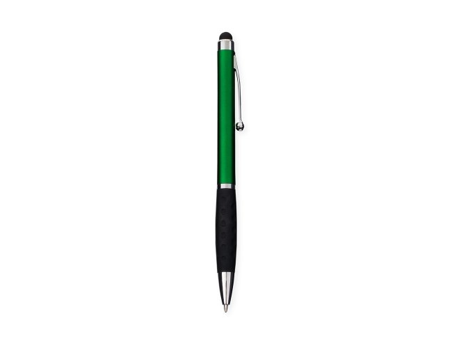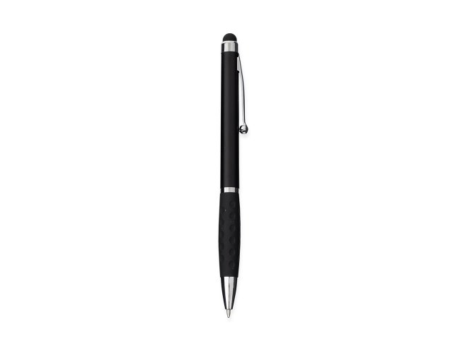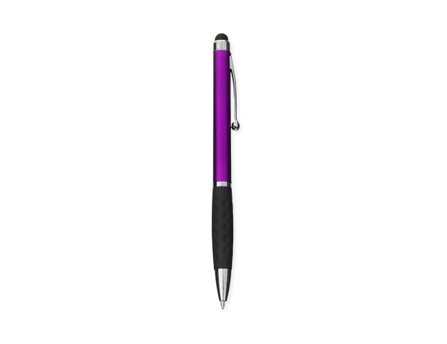 Caneta plástica com ponta, clip e pequenos detalhes em metal, além de detalhes ergonômicos na área próxima à tampa. Possui acionamento por rotação, carga esferográfica azul de 1.0mm e ponteira emborrachada para interação com dispositivos de telas sensíveis ao toque.