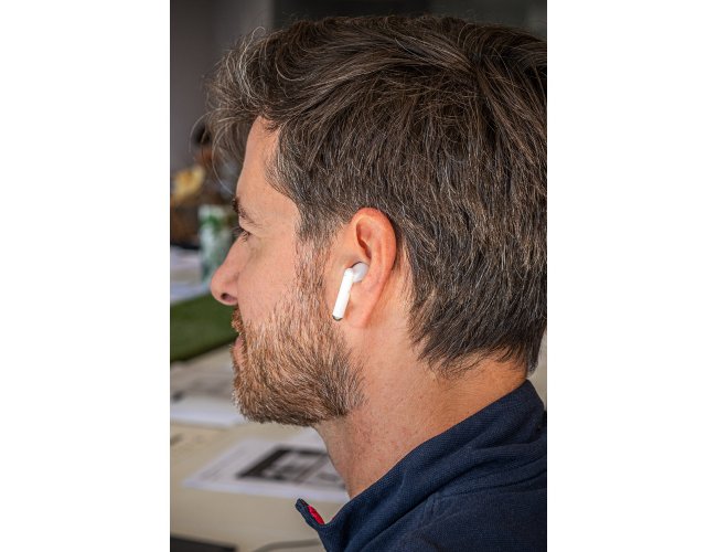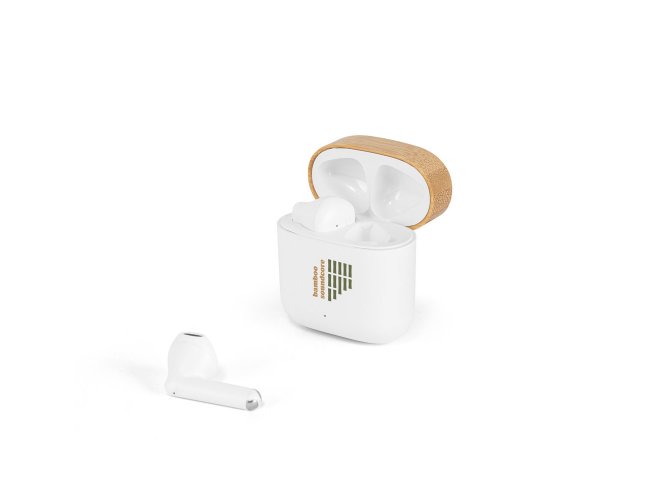 Fones de ouvido wireless em ABS 100% reciclado e caixa com tampa em bambu, com transmissão BT v5.3. A caixa de carregamento tem uma bateria de 300 mAh que permite carregar os fones, aproximadamente, 3 vezes com uma única carga, oferecendo uma autonomia, aproximada, de 5h. Os fones de ouvido permitem atender chamadas, controlar o volume e a playlist do dispositivo móvel. Incluso um cabo de carregamento USB-C em TPE 100% reciclado. Fornecido em caixa presente de papel kraft reciclado. A cor e o resultado da impressão nos materiais naturais pode variar entre produtos. 48 x 26 x 47 mm