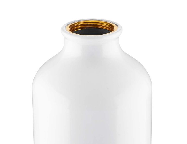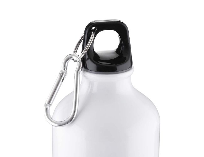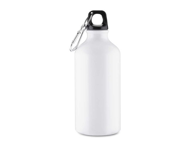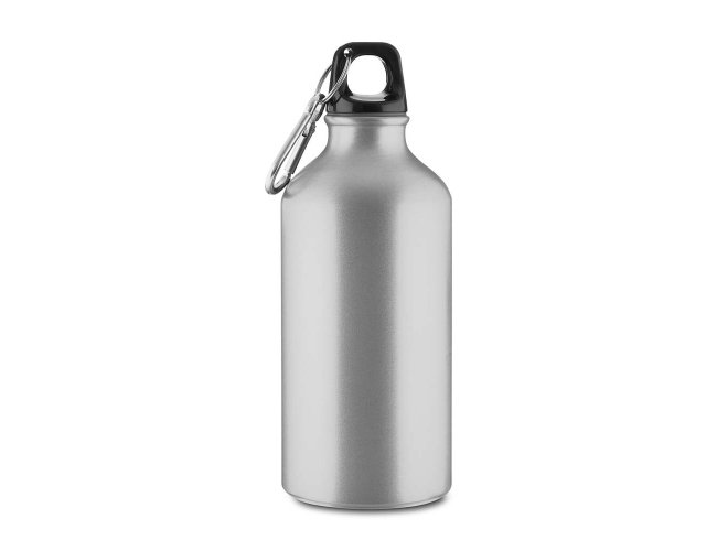 Garrafa em alumínio com capacidade para até 550ml. Conta com tampa rosqueável em plástico e mosquetão metálico acoplado à tampa para transporte.