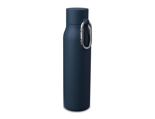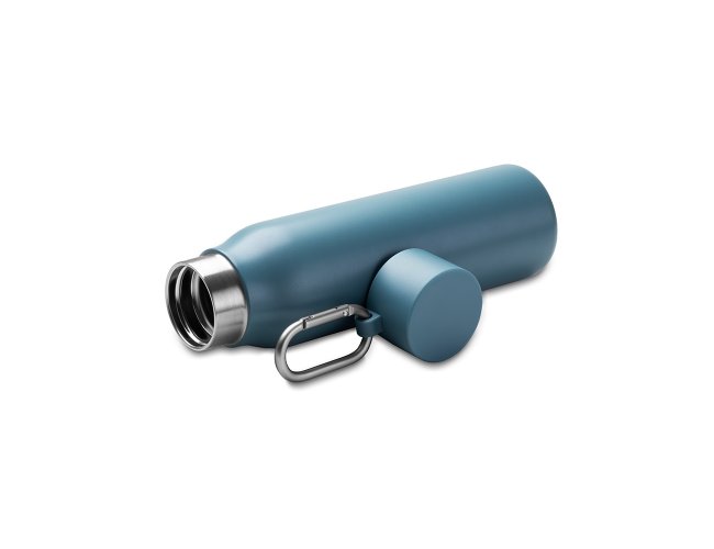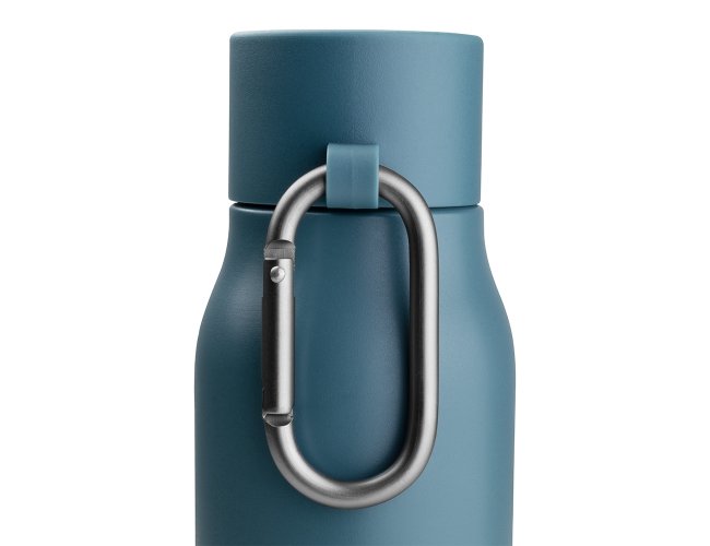 Garrafa térmica em inox 304 com pintura eletrostática e capacidade para até 550ml. Possui estrutura de parede dupla e vedação a vácuo, permitindo a conservação de temperatura de líquidos por mais tempo. Conta com tampa em plástico PP com mosquetão removível em alumínio para transporte.