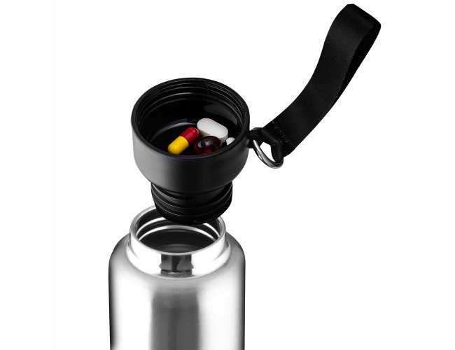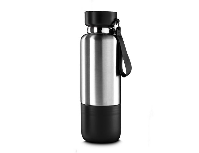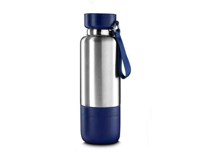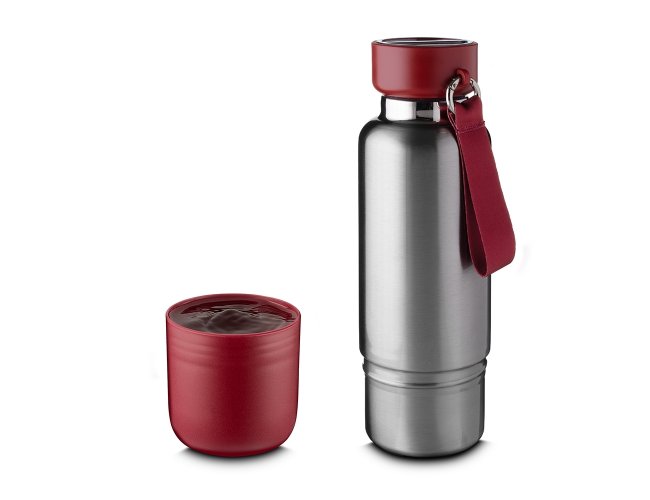 Garrafa térmica de 500ml em inox, com parede dupla e cordão tipo mosquetão. Possui tampa rosqueável, com uma tampa plástica na parte superior, que inclui um cordão adicional grande para substituição. A garrafa também conta com um copo adicional rosqueável na parte inferior.