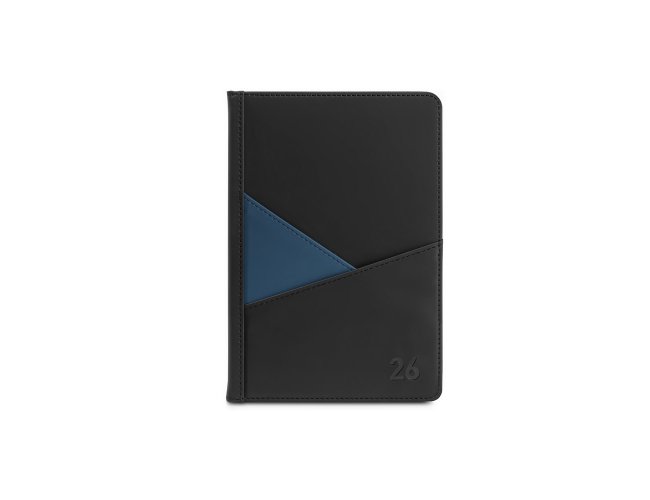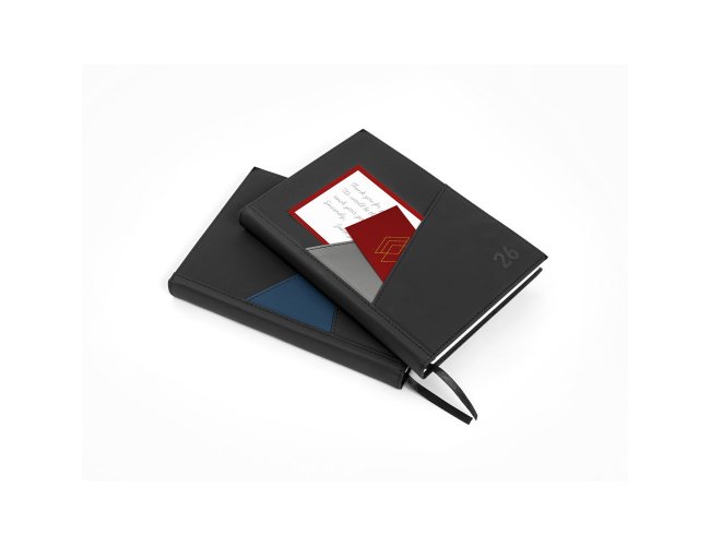 Agenda A5 em PU (58% reciclado), com fecho magnético e placa metálica. Possui um suporte para esferográfica (não inclusa) e um marcador em fita. Está organizada em plano diário (70 g/m²). 148 x 212 mm