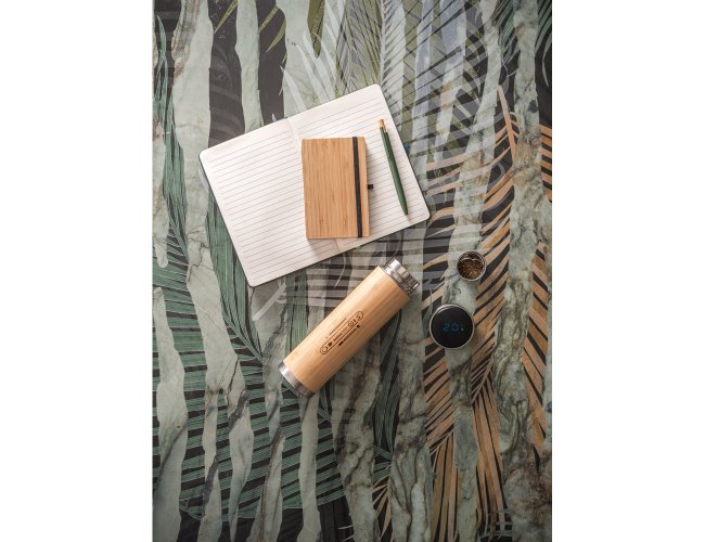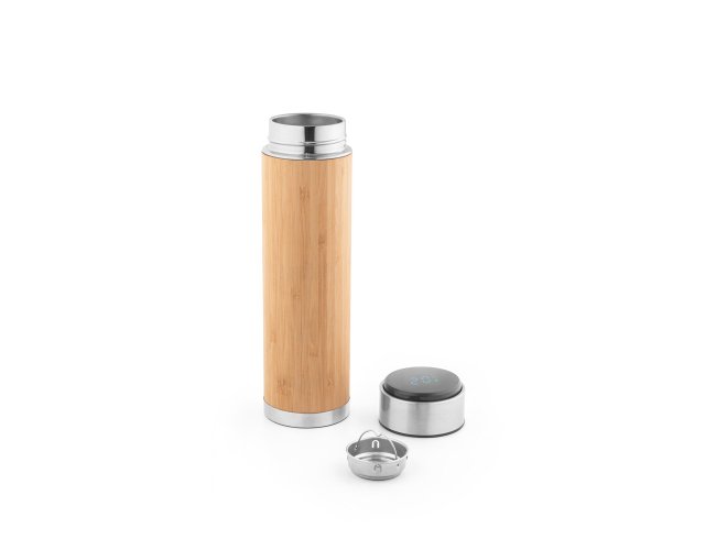 Garrafa em aço inox e bambu de parede dupla térmica, isolada a vácuo. Capacidade até 430 mL. A tampa contém um termômetro digital que permite saber, a qualquer momento, a temperatura da bebida. Inclusa pilha e infusor para chá. Certificação EU Food Grade. A cor e o resultado da impressão nos materiais naturais pode variar entre produtos. ø65 x 235 mm