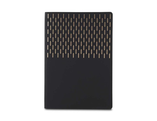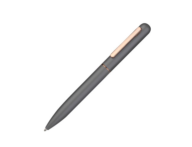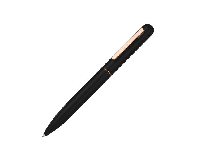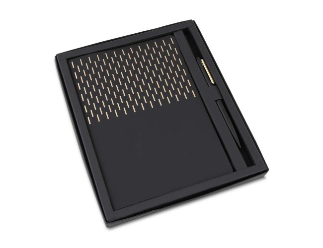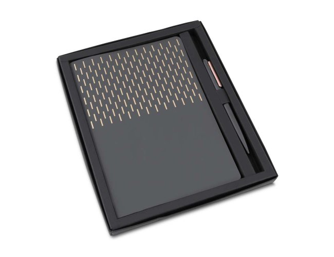 Conjunto composto por caderno com capa em PU com detalhe de gravação dourada, contendo 80 folhas pautadas em papel 70g/m², possui caneta modelo twist em alumínio reciclado na cor do caderno, com acabamento em detalhe rosê, possui estojo em papelão na cor preta.