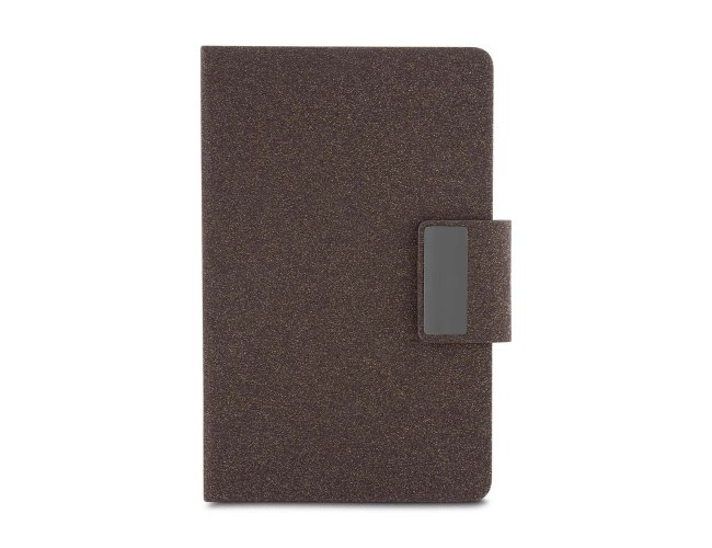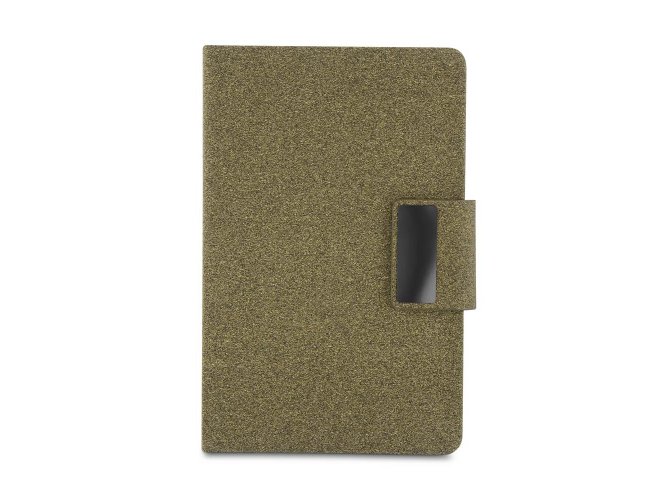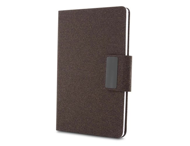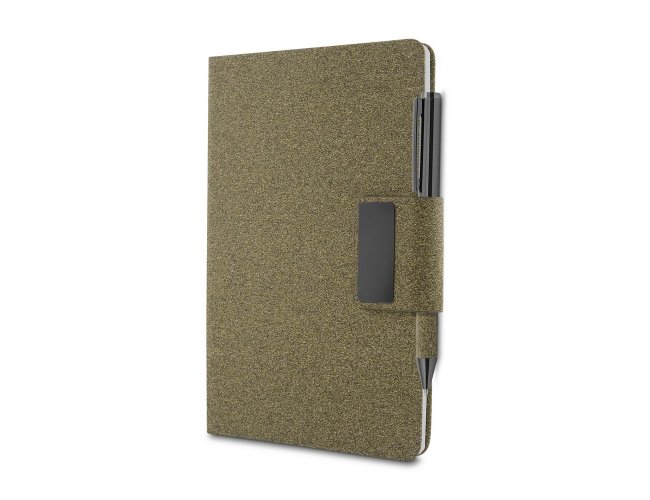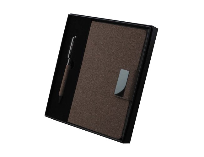 Kit de Escritório composto por caderno tamanho A5, com capa em PU e detalhe em fibra de chá ou café, contendo 80 folhas pautadas de 70g/m². Acompanha caneta metálica com acabamento no mesmo material de fibra, formando um conjunto elegante e sofisticado. O kit acompanha estojo de papelão na cor preta.