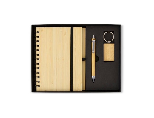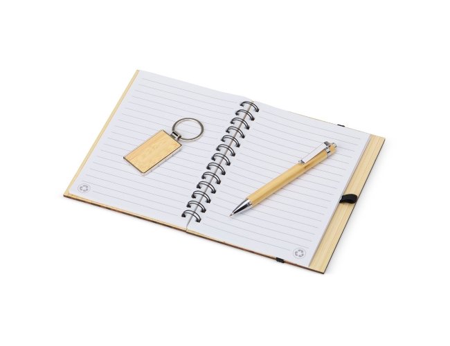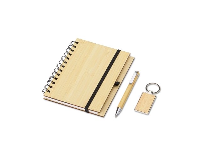 Kit executivo ecológico 3 peças em estojo de papelão. Contém: chaveiro de bambu com detalhe em metal, caderneta em bambu, capa dura, com aproximadamente 65 folhas brancas pautadas, caneta de bambu com clipe metálico, elástico para lacre e suporte para caneta em nylon.