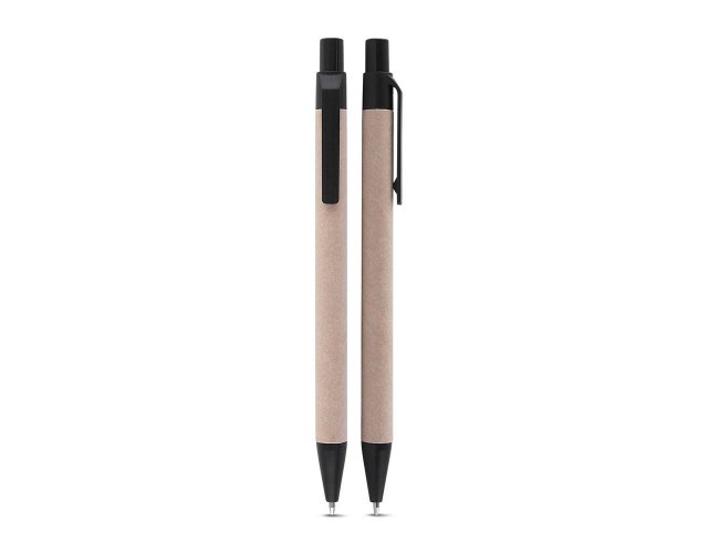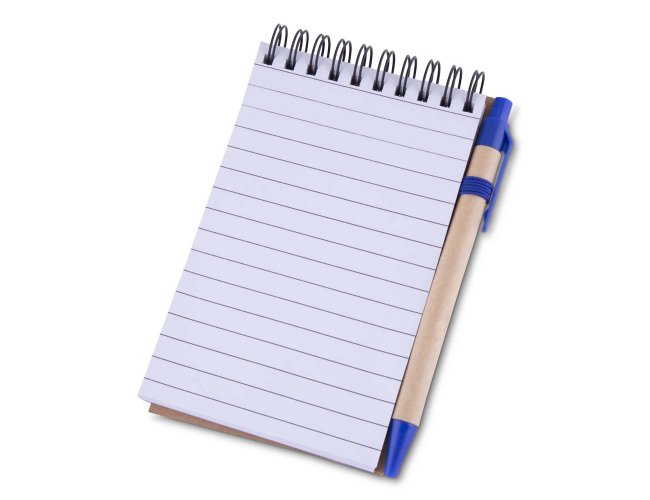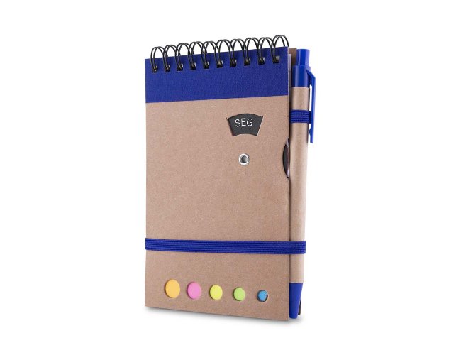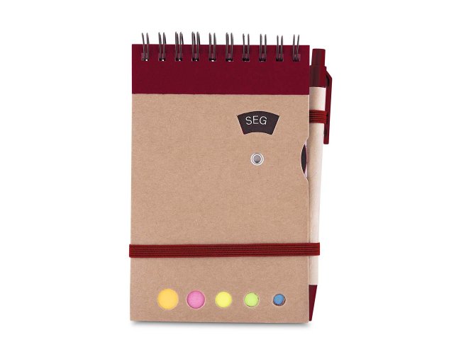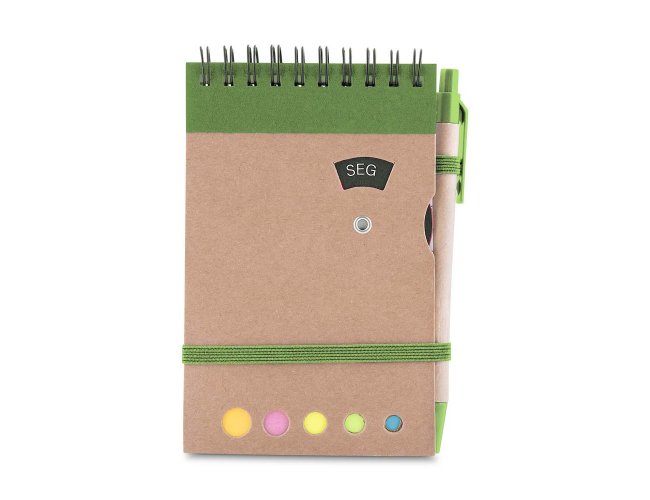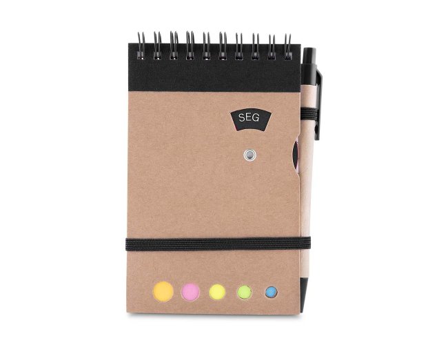 Mini Caderno com capa em papel kraft, miolo pautado, acompanhado de disco rotativo com dias da semana, caneta produzida em papelão reciclado com detalhes em plástico e bloquinho adesivo (sticky notes).