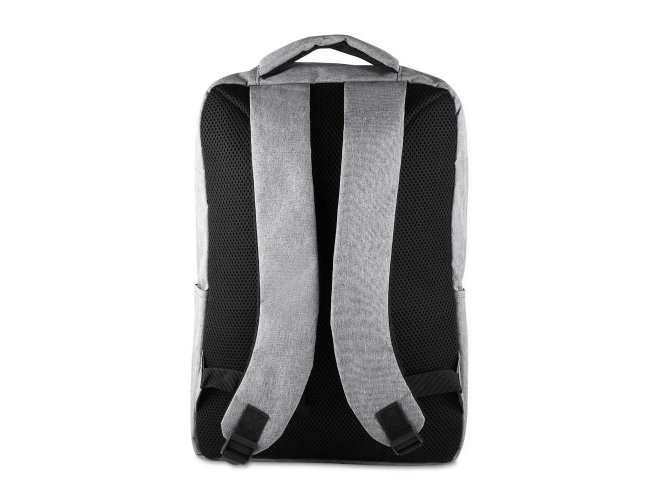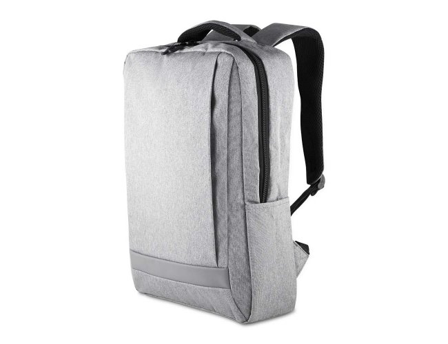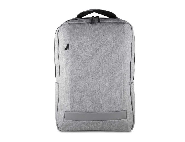 Mochila confeccionada em tecido externo de poliéster 300D com detalhe em PU e tecido interno em poliéster 210D, com capacidade total de 13,5 litros. Possui bolso frontal com fechamento em zíper, dois bolsos laterais e compartimento interno para notebook de até 15,6”.