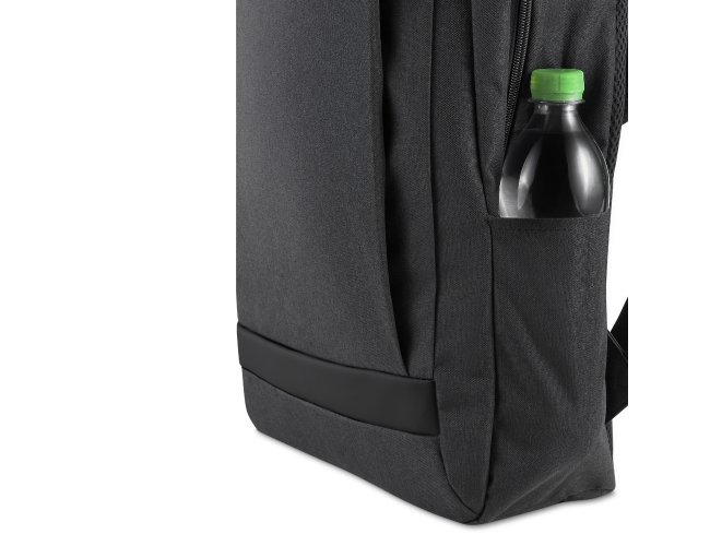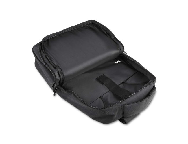 Mochila confeccionada em tecido externo de poliéster 300D com detalhe em PU e tecido interno em poliéster 210D, com capacidade total de 13,5 litros. Possui bolso frontal com fechamento em zíper, dois bolsos laterais e compartimento interno para notebook de até 15,6”.