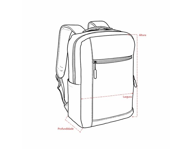 Mochila confeccionada em poliéster 300D resistente à água, com detalhes em couro sintético, fechamento em zíper e capacidade para até 15 litros. Possui compartimento principal com bolsos em diferentes tamanhos e divisória para notebooks de até 15.6 polegadas. Dispõe ainda de compartimento frontal com fechamento em zíper e faixa reflexiva, além de bolso lateral aberto e adaptador USB externo.