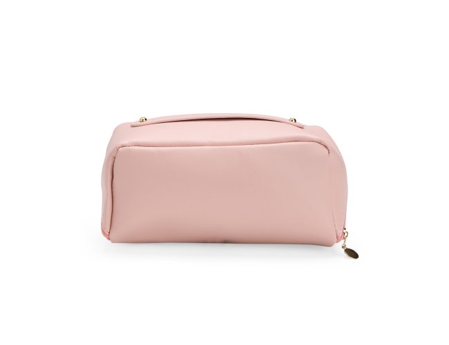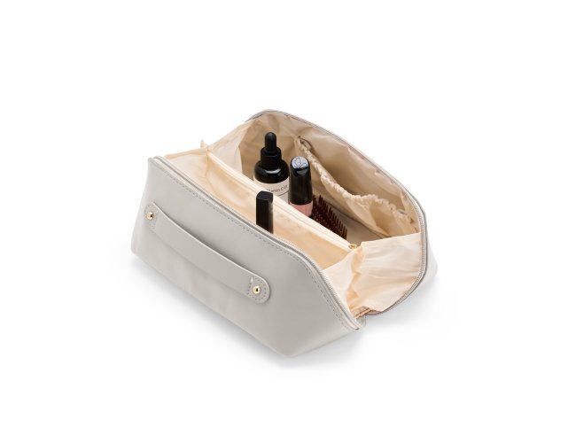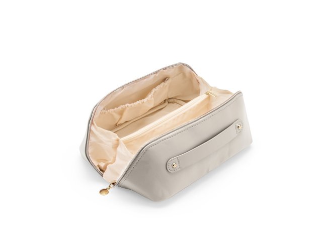 Nécessaire em poliuretano (PU) impermeável com abertura em 180 graus inspirada no formato de concha. O compartimento interno conta com dois bolsos laterais abertos e um, localizado na parte central, com fechamento em zíper. Possui alça para transporte.
