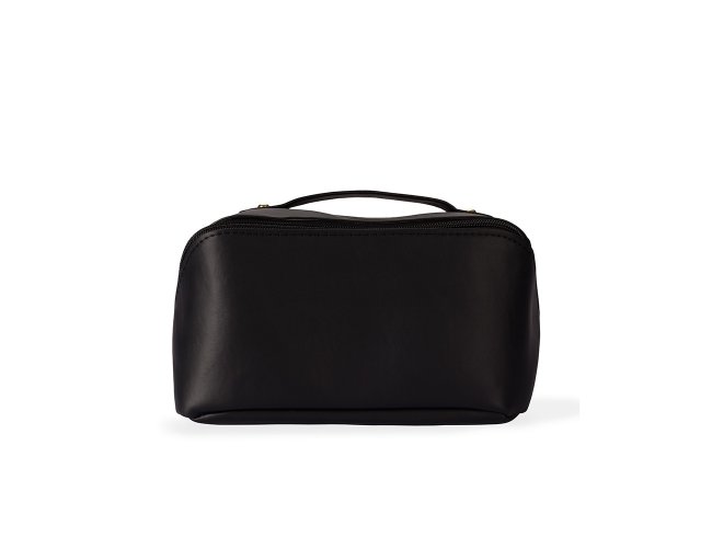 Nécessaire confeccionado em poliuretano (PU) impermeável com abertura em 180 graus que remete ao formato de uma concha. Possui amplo compartimento interno com dois bolsos laterais abertos e um central com fechamento em zíper. Contém uma alça para transporte.
