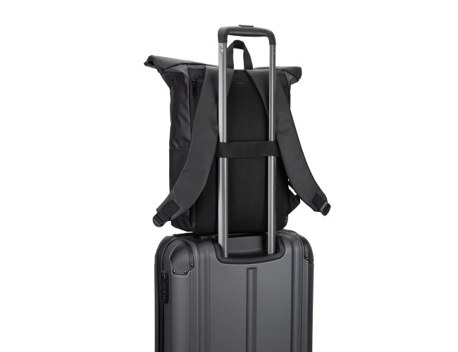 Mochila "Roll top", um design em sistema de fecho que permite enrolar a parte superior até ajustar ao volume da mochila. Composta por poliéster reciclado 600D de alta densidade com revestimento resistente à água e forro em poliéster reciclado 210D. O acabamento desta mochila confere-lhe um soft touch, tornando a sua utilização mais confortável. Possui um compartimento principal com bolso almofadado para notebook até 14", bolsos laterais e um bolso frontal com zíper impermeável. O acesso ao notebook pode ser feito pelo compartimento principal ou na parte posterior através do zíper. A parte posterior em malha incorpora uma alça trolley. Capacidade até 20 L. 270 x 440 x 150 mm