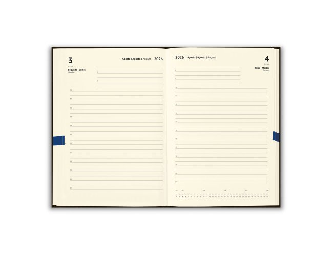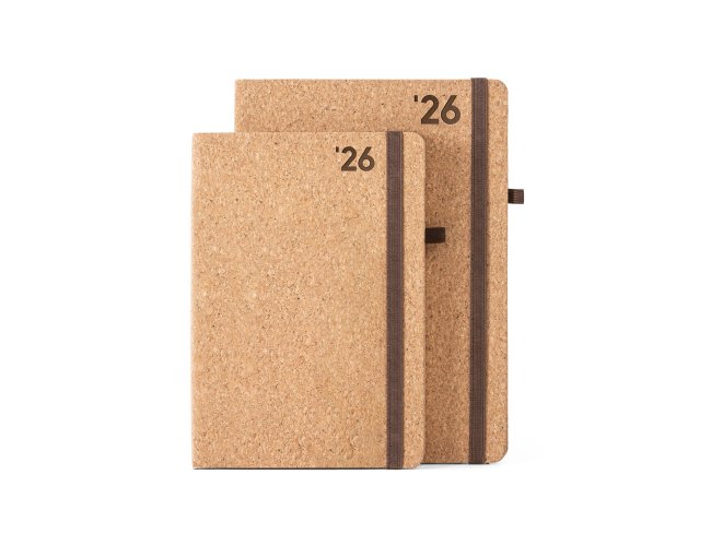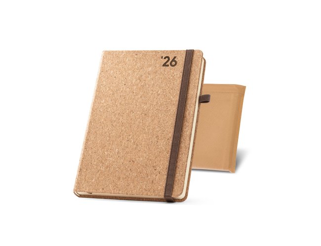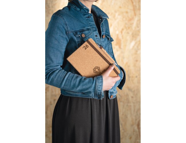 Agenda A5 em cortiça. Possui um suporte para esferográfica (não inclusa), miolo em cor marfim e marcador em fita. Está organizada num plano diário (70 g/m²). Fornecida em bolsa de non-woven. 148 x 210 mm | Bolsa: 205 x 250 mm