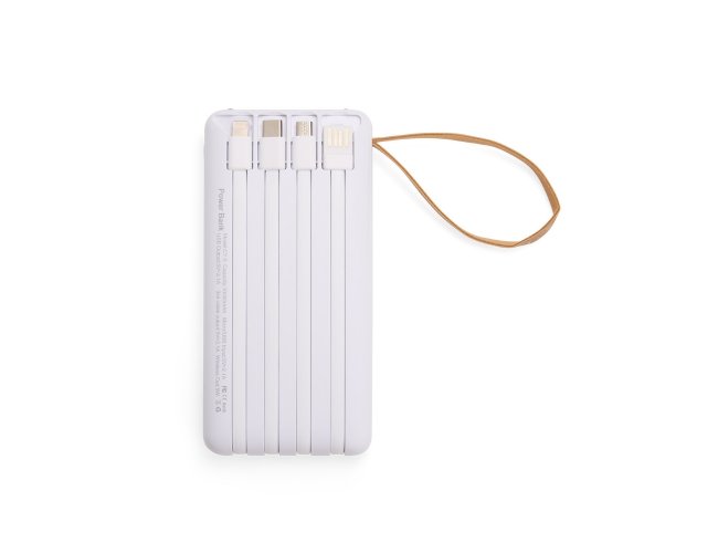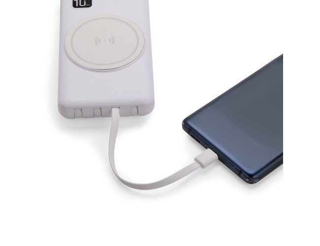 Power Bank em plástico com capacidade de 10.000mAh. Possui quatro cabos integrados com saídas para Lightning, USB-C, Micro-USB e USB, além de área de recarga por indução magnética para dispositivos compatíveis e lanterna de LED. Conta ainda com entradas USB-A e USB-C para recarga do próprio aparelho e alça de tecido sintético para transporte.
