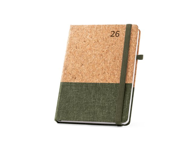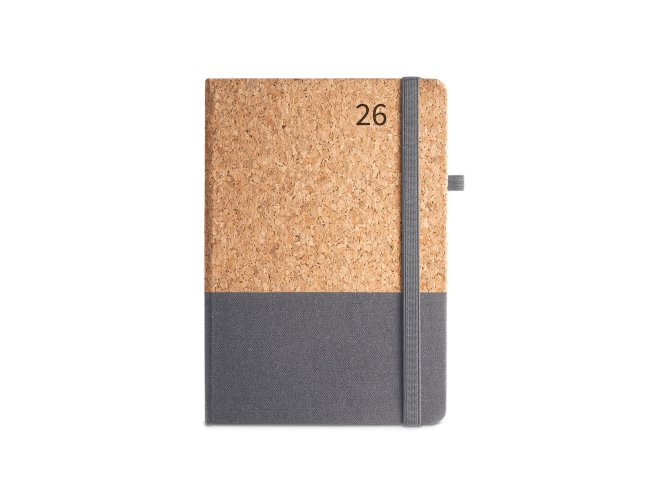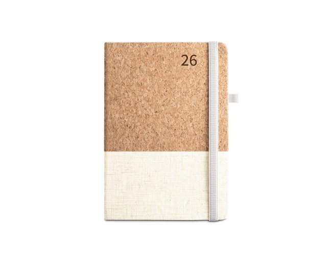 Agenda B5 em cortiça e linho. Possui um suporte para esferográfica (não inclusa), marcador em fita e elástico para fecho na mesma cor. Está organizada num plano diário (70 g/m²). Fornecida com bolsa de non-woven. 148 x 210 mm | Bolsa: 205 x 250 mm