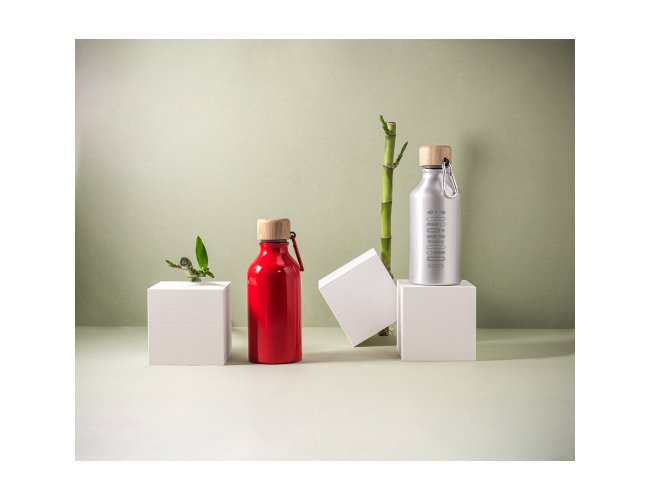 Squeeze em alumínio 100% reciclado com cor sólida brilhante. A squeeze tem uma tampa em bambu, à prova de água, e mosquetão que facilita o transporte. Capacidade até 400 mL. Caixa branca 94656 vendida opcionalmente. Certificação EU Food Grade. A cor e o resultado da impressão nos materiais naturais pode variar entre produtos. ø66 x 171 mm