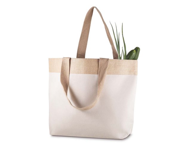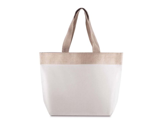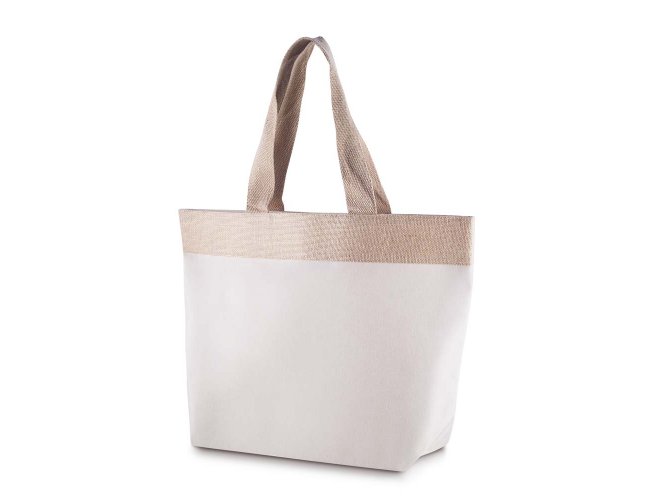 Sacola em Algodão Cru 220g/m² com detalhe em Juta. Alça com altura de 24 cm, ideal para transporte.