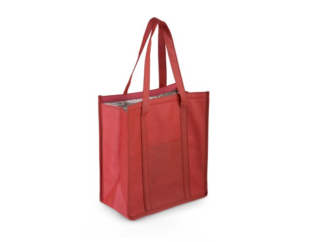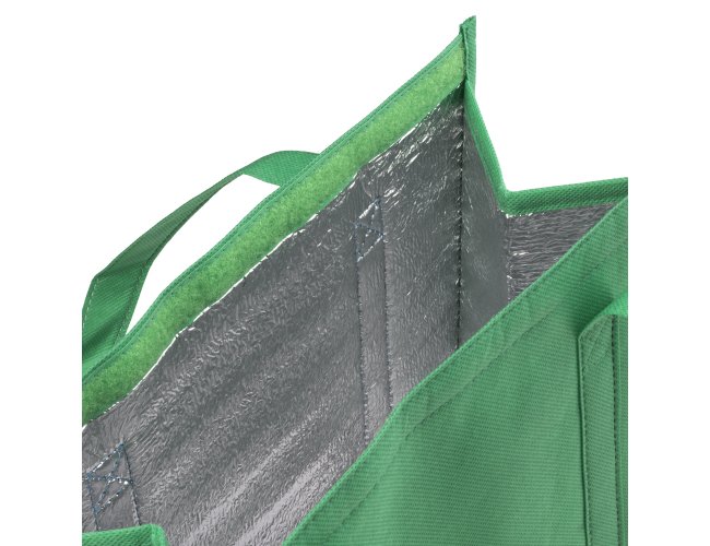 Sacola térmica em TNT com 80g/m², interior costurado revestido em algodão e folha de alumínio de 2mm. Possui alça com 50cm de ponta a ponta. Conta com um bolso frontal e fêcho em velcro.