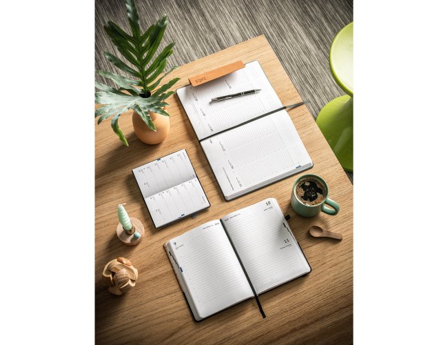 Agenda B5 em pele reciclada (58%) com fecho magnético. Está organizada num plano semanal. Inclui suporte para esferográfica (incluída) e marcador em fita. Fornecida com bolsa de non-woven. 175 x 245 mm | Bolsa: 220 x 270 mm