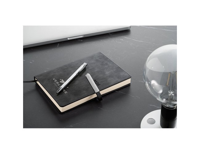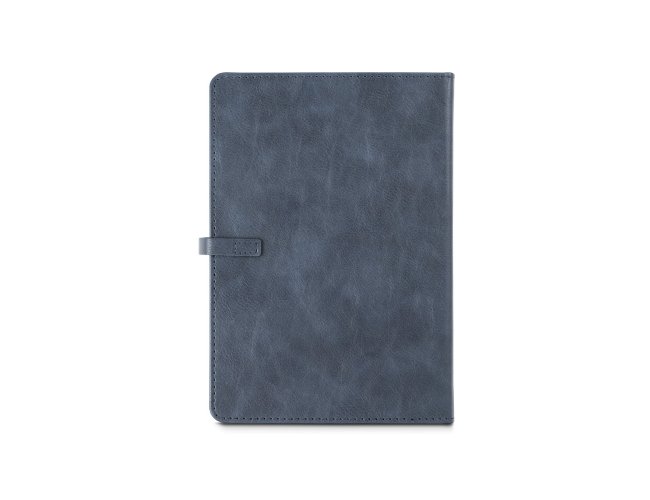 Agenda B5 em PU, com fecho magnético e peça metálica brilhante. Possui um suporte para esferográfica (inclusa) e marcador em fita. Está organizada num plano diário (70 g/m²). Fornecida com bolsa de non-woven. 148 x 210 mm | Bolsa: 205 x 250 mm