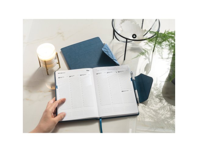 Agenda B5 em PU com fecho magnético. Está organizada num plano semanal. Com suporte para esferográfica (inclusa) e marcador em fita. Fornecida com bolsa de non-woven. 175 x 245 mm | Bolsa: 220 x 270 mm