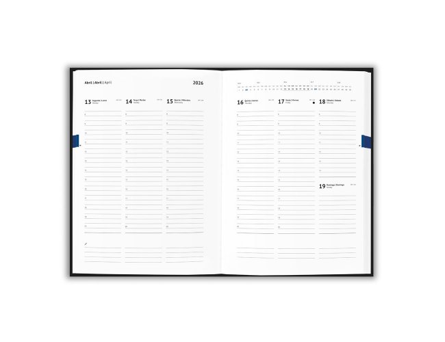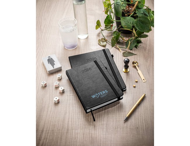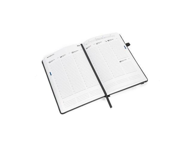 Agenda A5 em PU à base de água. Inclui um suporte para esferográfica (não inclusa), marcador em fita e um elástico para fechamento da agenda. Está organizada em plano diário (70 g/m²). 148 x 210 mm