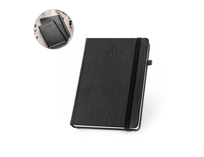 Agenda B5 em PU à base de água. Inclui um suporte para esferográfica (não inclusa), marcador em fita e um elástico para fechamento da agenda. Está organizada em plano semanal (70 g/m²). 175 x 245 mm